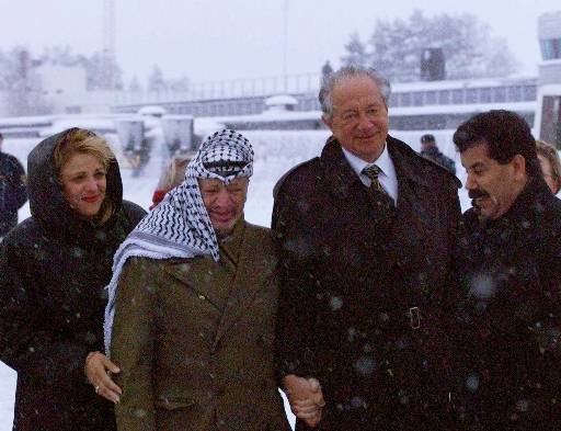 中新网11月12日电 1998年12月5日,阿拉法特访问瑞典,与瑞典前首相安德森会面,左一为阿拉法特的妻子苏哈。(春风)
