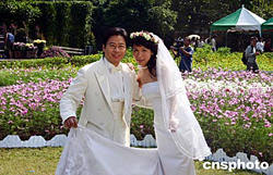 11月12日,台北市士林官邸举办大型菊展,吸引了数以千计的民众观赏。图为一对新人在菊花丛前拍摄婚纱照,场面温馨浪漫。中新社记者:董会峰