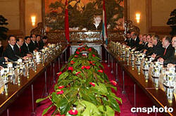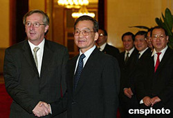 中国国务院总理温家宝十一月十二日在北京会见卢森堡首相容克。中新社记者:满会乔