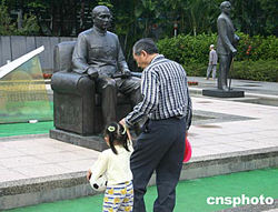11月12日是孙中山先生诞辰138周年,台北举办一系列活动予以纪念。图为一位台湾民众带着孙女在孙中山纪念馆前。中新社记者:董会峰