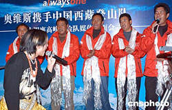 西藏登山队明年将与奥维斯体育文化传播公司继续共同推进“2004-2008地球第三极珠峰环保大行动”,清理海拔6500米-8000米间的登山遗弃物。十一月十三日,合作双方在北京秀水南街的一个西藏风情餐吧举行媒体见面会,图为登山队队长桑珠(右五)、横跨珠峰第一人次仁多吉(右四)、13高峰攀登者边巴扎西(右三)、仁那(右一)及雪山之子洛则与公众见面。中新社记者:邹宪