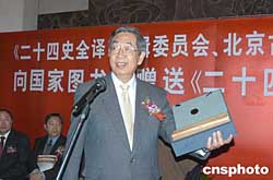 十一月十六日,《二十四史全译》编辑委员会暨北京古今出版策划有限公司将《二十四史全译》珍藏本一套和精装本两套赠送中国国家图书馆。《二十四史全译》主编、全国人大副委员长许嘉璐在北京国家图书馆举行的赠书仪式上致辞。作者:徐曦弋