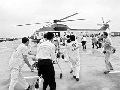 机场浓烟滚滚,两辆消防车对准飞机喷水,机组迅速打开舱门,施放紧急滑梯疏散旅客。机场医疗急救力量8辆救护车、60名担架队员也到达现场,医疗人员根据受伤轻重分别在场地上不同区域插上红、黄、绿、黑、白五色旗,担架队员抬着担架冲向失事飞机迅速将伤员转离飞机,送往临时搭建的医疗验伤区。