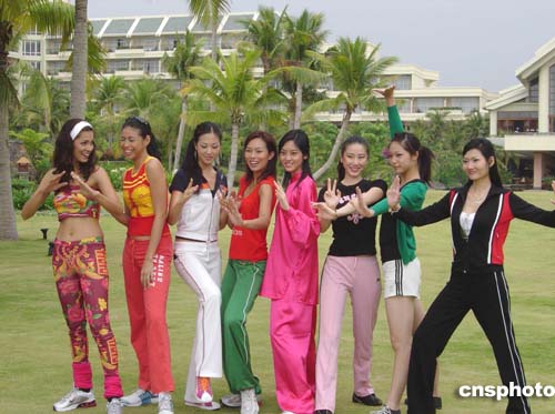 11月17日上午,在海南三亚参加第五十四届世界小姐总决赛的亚洲区佳丽在教练知道下练习中国太极拳,为18日举行的“运动美人”比赛做好准备。图为练习中的泰国小姐、菲律宾小姐、韩国小姐、香港小姐、中国小姐、马来西亚小姐、中国台北小姐、新加坡小姐(从左到右)。作者:张河静