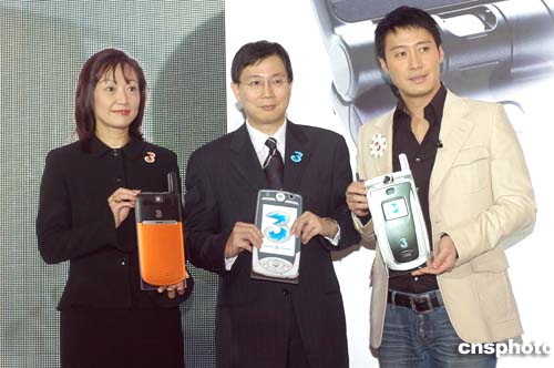 歌星黎明11月17日在香港出席和记电讯新型号3G视像手机推介记者会,和记电讯行政总裁吕博闻及3香港董事总经理李家慧与及歌星黎明于记者会上,共同推介三大型号3G视像手机将强势登场。作者:邓庆乐