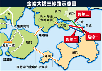 据陈家欣介绍,金门有关方面去年8月开始,已委托民间工程顾问公司展开金嶝大桥的可行性研究,共提出了三套路线方案,金门桥址均选定为东北角的马山,第一个方案经过角屿、小嶝到大嶝,长8.2公里;第二个方案直接由金门建大桥通大嶝东侧的环岛道路,长6.8公里;而第三个方案则经过小嶝到厦门与南安交界连接国道和高速公路附近。金嶝大桥借助几个岛屿进行接转,跨度较金厦和平大桥减短了许多,初步估计,建桥费可节省近半。