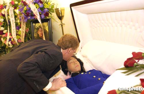 当地时间十一月十八日,自杀身亡的美国华裔女作家张纯如遗体告别仪式在加州洛斯加托斯市的殡仪馆举行,张纯如的丈夫道格拉斯吻别爱妻。作者:陈钢