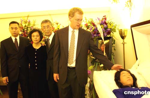 张纯如的丈夫道格拉斯(右一)爱恋地抚摸着静卧在灵柩中的妻子的头发,不忍爱妻离自己而去。张纯如的父亲张绍进(左三)、母亲张盈盈(左二)和弟弟(左一)也站在灵柩旁陪伴。作者:陈钢