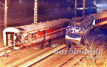 昨日22时30分许,哈尔滨市乡政跨线桥下一列由佳木斯开往北京的K340次旅客列车与一辆火车头相撞,事故造成至少3人受伤。目前伤者正在二一一医院抢救,其余旅客被安全疏散。事故造成该段铁路暂时中断。