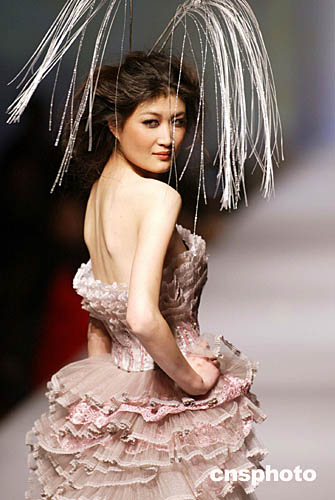 十一月二十一日,一名模特在北京T型台上演绎时装设计师罗峥的作品“绽放”,这是二零零四中国国际时装周上的精彩一幕,独特的设计令观众眼前一亮。中新社记者:盛佳鹏