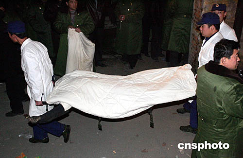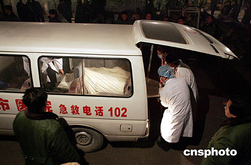 二零零四年十一月二十一日晚,经过连续搜索抢救,河北省邢台市沙河矿难死亡人数又有所增加,又有十多名矿工的遗体被抬出金鼎铁矿巷口。中新社记者:武仲林