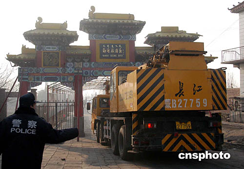 11月22日上午,紧急从包头钢铁公司调来的重型吊车抵达空难事故地点——包头南海公园,协助打捞11.21空难失事客机的残骸。中新社记者:张宇