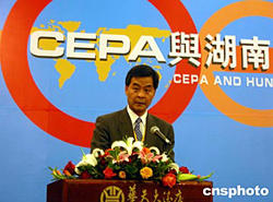 香港特别行政区会议召集人梁振英,11月22日在长沙举办的CEPA与湖南经济发展高峰论坛上谈CEPA下湖南与香港两地的经济合作。作者:邓霞