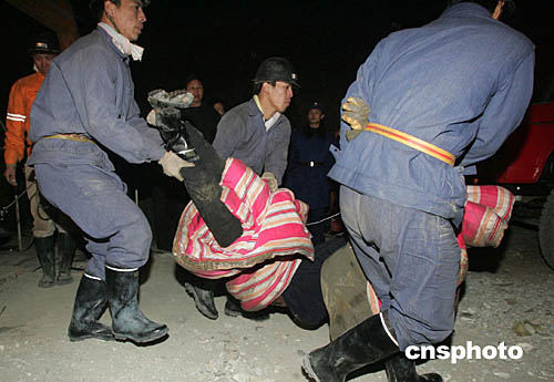 中新社沙河十一月二十二日电(记者孙宇挺)今天下午六点半,伴随着一声尖锐的信号铃声,位于着火点的白塔镇章村李生文矿的八位受困人员开始升井,十五分钟以后,所有八具用棉被包裹的尸体全部从白塔镇二铁矿直井口运出,至此,河北沙河市“一一·二0”矿难事故死亡人数上升至五十七人,此次矿难事故中受围困的一百零六人仍有三人下落不明。