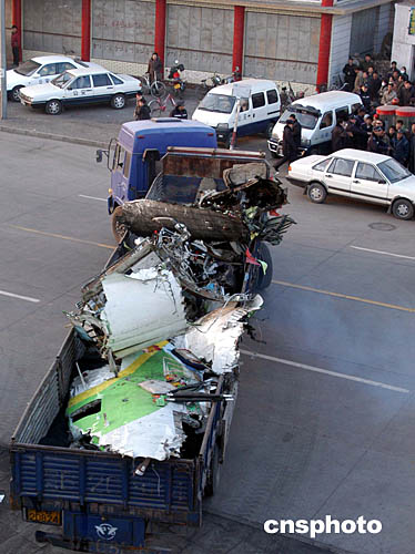 11月22日下午,11.21包头空难事故现场打捞上的大块飞机残骸装上货车运离,机壳图案清晰可见。中新社记者:张宇