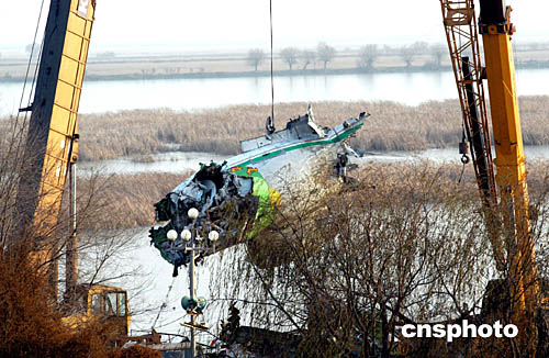 十一月二十二日下午,11.21空难事故发生第二天,从包钢紧急调来的两辆重型吊车正在包头南海公园吊起失事客机的机尾部分。中新社记者:张宇