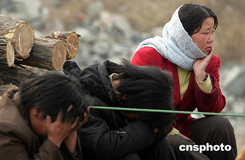 二零零四年十一月二十二日,“11.20”河北沙河矿难救援工作仍在进行。截止当日十九时三十分,河北沙河矿难遇难矿工人数已达五十七人,另有三人人下落不明。图为仍没有获救的遇难矿工家属在矿井附近焦急等待。中新社记者:武仲林