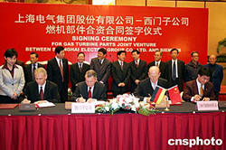 十一月二十三日,上海西门子燃气轮机部件有限公司成立签约仪式在沪举行。该公司是由西门子公司和上海电气集团股份有限公司共同投资五千五百万欧元合作成立的。图为签约仪式现场。作者:汤彦俊