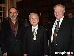 11月22日晚,中国著名建筑学家吴良镛教授在巴黎出席法国建筑科学院院士就位仪式。吴良镛教授是在1999年获得该院外籍院士称号的,事隔5年,他终于有机会专程赴巴黎举行就位仪式。拥有300名院士的法国建筑科学院有60名外籍院士,吴教授是3名中国籍院士之一。图为吴良镛院士和法国建筑科学院院长(右)和中国国家大剧院的设计者、法国建筑师安德鲁在就位仪式上合影。作者:钟诚