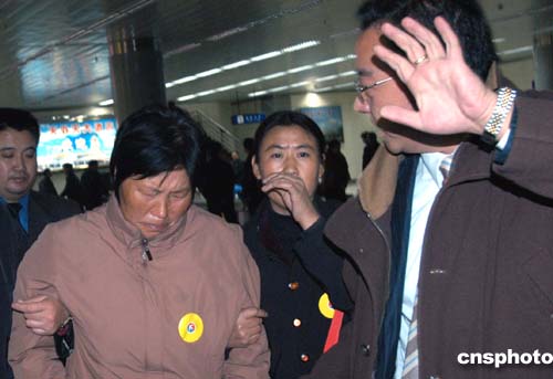 包头11.21空难事故中的机组人员家属,11月23日深夜乘坐飞机抵达包头。作者:张宇