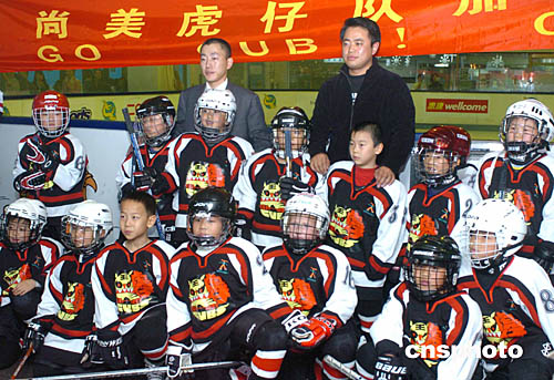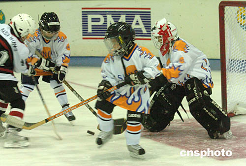 2004年亚太区少儿冰球赛25日在香港西九龙中心举行﹐北京尚美虎仔队(黑衣)以六比零战胜香港队。