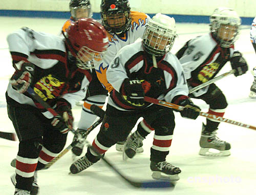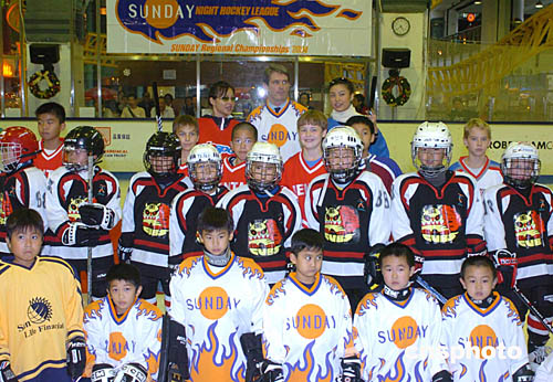 2004年亚太区少儿冰球赛25日在香港西九龙中心举行﹐来自北京﹑新加坡﹑美国﹑加拿大﹑英国﹑澳洲等14支队150多名选手参加本次比赛﹐中新社记者:赵振清
