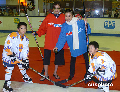 香港艺人李绮虹﹑廖碧儿25日在香港西九龙中心为2004年亚太区少儿冰球赛开球。