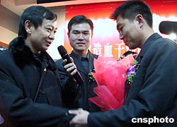 十一月二十六日,中国造血干细胞捐献者资料库志愿者突破二十万人份新闻通报会在北京召开。据了解,中国造血干细胞捐献者资料库自二零零一年重新启动以来,到目前已有一千六百多位患者配型成功,并已有一百八十一位志愿者捐献了造血干细胞。但是,目前造血干细胞资料库离现实需要仍有较大差距。图为捐献者张德柱(右)与白血病康复者邹隆锦(左)首次见面。作者:韩艺冰