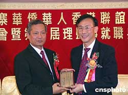 二十七日晚,柬埔寨华侨华人香港联谊会在此间假借尖沙嘴海港城皇宫大酒店,举办成立庆典暨第一届理监事就职典礼。柬埔寨王国驻香港总领事馆陈明光总领事(左)到会致贺辞,并接受首任会长郑中赠送的纪念品。作者:关向东
