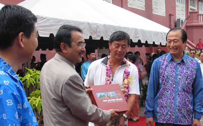 庆祝仪式举行的地点荷兰红屋也颇为传奇。它座落于马六甲河畔,建于1641至1660年间,是东南亚最古老的荷兰建筑物,有着厚厚的红砖墙,笨重的硬木门,和门前宽阔的石级。特色不变,却几经变迁。荷兰红屋原为教堂,后来改为市政府,现在成了马六甲博物馆,藏有马来、葡萄牙、荷兰和英国的历史文物。穿越近400年的岁月,荷兰红屋也是马来发展变化的见证者。仪式就是在这样历史感颇强的场景氛围中开始的。