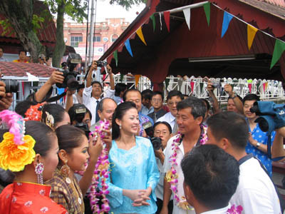 29日一早,在舞狮及具马来特色的舞蹈的热烈欢迎下,“凤凰号”船员乘坐摆渡船缓缓航行到达红屋码头。马来西亚、印度裔及华裔少女身着特色服装为这3位乘风破浪的“凤凰号”英雄们献花致敬。随后,搭乘花车到达庆祝仪式现场。在凤凰卫视主持人萨文和2004年度中华小姐大赛冠军李诗琪的主持下欢迎仪式正式开始。