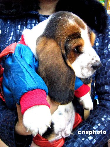 11月29日,在南京夫子庙宠物市场,一条名为巴吉度的德国犬种宠物狗身穿面料考究、做工精良、款式新颖的小棉袄和背带裤由主人抱着逛市场,一幅悠闲自得的模样。孙忠南 摄