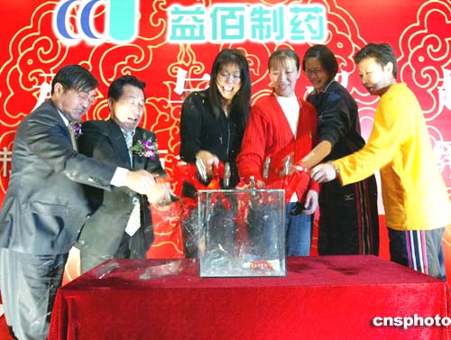 由贵州益佰制药主办的“传承与超越”·铁榔头正红花油膜贴产品上市新闻发布会十一月三十日在北京举行,该产品形象代言人郎平与现中国女排队长冯坤、赵蕊蕊、教练赖亚文以及贵州益佰制药董事长叶湘武等高举象征着“铁榔头精神”的锤子进行破冰仪式,新产品应声而出。作者:李刚