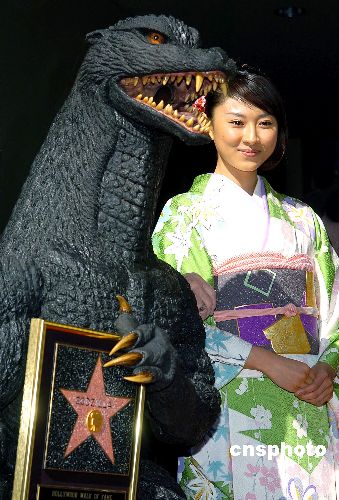 11月29日,又一位明星被载入美国好莱坞星光大道,成为这条大道上的第2271颗星。不过,这位明星并非人类,而是曾经令无数观众痴迷的巨怪“哥斯拉”。这个日本人创作的恐怖灾难片巨星在美国与“金刚”齐名,可谓是家喻户晓。图为“哥斯拉”在留名典礼上,在这个重要场合,连它也少不了美女相伴。Ic/cnsphoto
