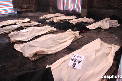 陕西省铜川矿务局陈家山煤矿发生瓦斯爆炸事故后,166名矿工被困井下。截至1日上午,井下发现65具遇难者遗体,其中21具遗体已经升井。(来源:新华网;记者刘铮、吴锦瑜)