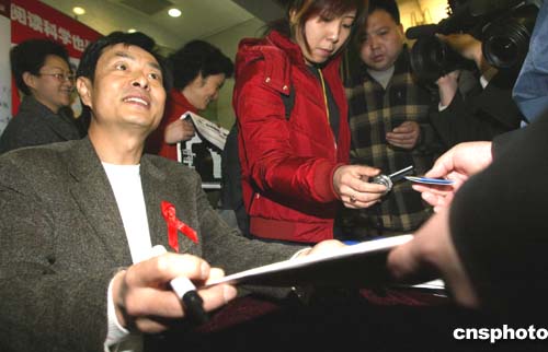 十二月一日是世界艾滋病日,著名电影演员、预防艾滋病形象大使濮存昕在北京王府井大街为市民签名发放安全套。作者:史利