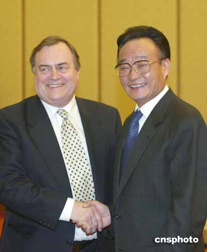 十二月一日,全国人大常委会委员长吴邦国在北京人民大会堂会见了英国副首相约翰·普雷斯科特。作者:廖文静