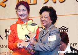 香港影视红星杨千嬅12月1日出席“世界爱滋日展览”活动,接受特首夫人董赵洪娉赠送纪念品,杨千嬅作为联合国艾滋病规划署香港大使,获得公众投票选举为最高的难忘人物。作者:洪少葵
