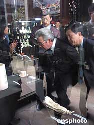 正在广东访问的吉尔吉斯斯坦总理尼古拉·塔纳耶夫十二月一日来到广东民间工艺博物馆(陈家祠)参观。图为塔纳耶夫总理仔细欣赏陈家祠内精美的象牙雕刻工艺品。作者:郭军