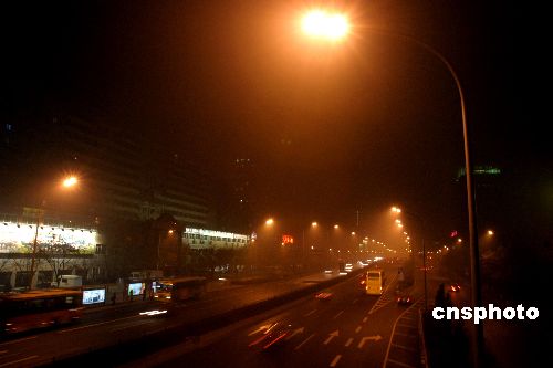 近日,针对北京持续大雾天气,北京启动了雾天路灯照明应急方案,雾天的路灯照明时间变更为开灯时间比平时早15分钟、关灯比平时晚15分钟。鲁谷 摄
