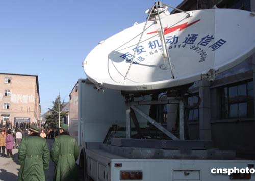 陕西铜川矿务局陈家山煤矿11月28日发生重大瓦斯爆炸事故后,中国各地媒体第一时间从四面八方蜂拥而至这个小山沟,各显神通全方位报道事故的方方面面。图为上海东方卫视以每日两万元人民币的租价,从西安租用的卫星通讯车。作者:任晨鸣