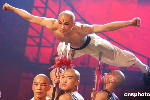 由天创国际演艺制作交流有限公司推出的耗资千万元人民币的大型常态功夫剧《功夫传奇》十二月三日晚在北京首演,本剧以精湛绝伦的中华功夫、赏心悦目的舞蹈,表现了“磨难”与“成长”的人生主题。图为《功夫传奇》中表现铸练场景。作者:张宇