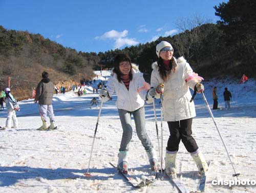 一场清风吹散了持续三日的大雾,北京十二月四日迎来了蓝天白云的好天气。许多北京市民纷纷涌至郊区滑雪场放飞心情。仅北京密云云佛山滑雪场就迎来了上万名滑雪爱好者。图为两名女青年在滑雪场尽情嬉戏。作者:吴庆才