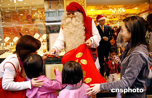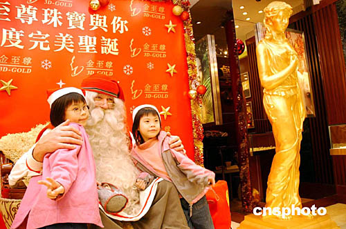 图为圣诞老人在金至尊珠宝店向市民赠送礼物。
