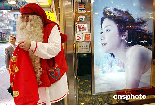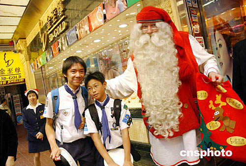 图为圣诞老人在铜锣湾闹市向市民赠送礼物。