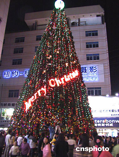 进入十二月,虽然离圣诞节还有段时日,但福州街头的圣诞气氛已开始变浓。图为一商场为吸引顾客,在商场外树起巨大的许愿圣诞树,吸引许多人。作者:王东明