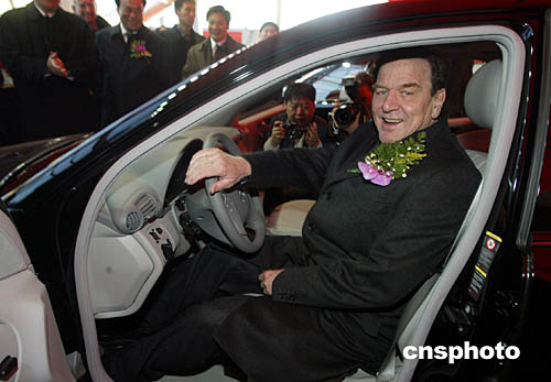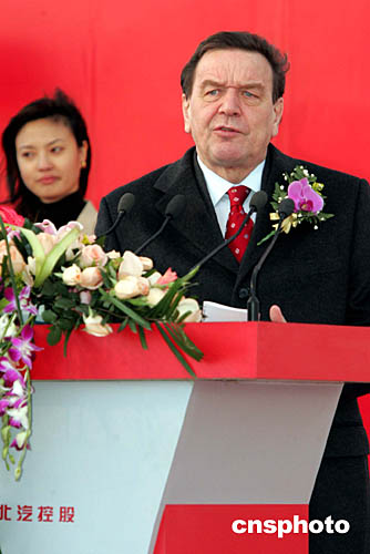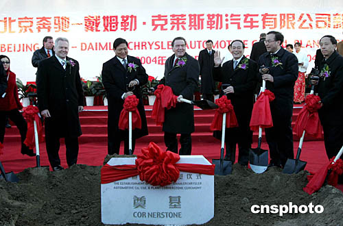 十二月六日,北京奔驰-戴姆勒·克莱斯勒汽车有限公司新工厂奠基仪式在北京经济技术开发区举行,德国总理施罗德亲临现场出席仪式,并在致辞时指出,“今天的活动体现了德意志联邦共和国与中华人民共和国经济合作的进一步深入”。北京奔驰-戴.克公司新厂区占地面积六万二千七百七十七平方米,将是一座拥有世界汽车制造业先进技术和最优秀品牌的汽车制造厂,新增年生产能力为二万五千辆梅赛德斯-奔驰E级和C级轿车。中新社记者:毛建军