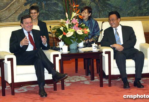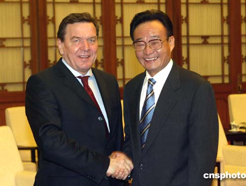 施罗德赞同吴邦国对德中关系的评价。他说,中德关系建立在相互信任的基础上,各个方面的合作都很好。德国政府重视德中关系,将继续坚持一个中国政策。德方愿进一步加强两国议会业已存在的良好合作关系。同时,愿继续加强与中国的民间交往,以及文化交流。德方愿与中方一道使德中关系始终保持高水平的发展。