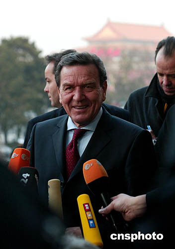 德国总理施罗德十二月七日与中国国家主席胡锦涛在北京进行会见后,在人民大会堂外被中外媒体“围堵”。中新社记者:满会乔