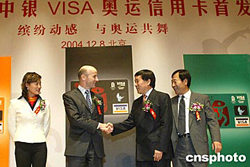 十二月八日,中国银行联手Visa国际组织,在北京发行全球首张以二零零八年奥运会为主题的“中银VISA奥运信用卡”。中新社记者:廖文静